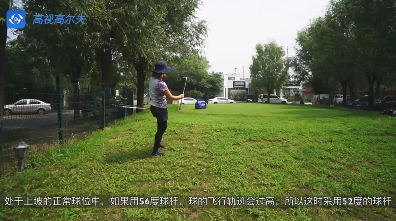 處于上坡的正常球位中,如果用56度球桿,球的飛行軌跡會(huì)過(guò)高,所以這時(shí)采用52度球桿效果會(huì)很好。身體的重心也要70%在左腿一側(cè),以及站位要把球位較平時(shí)球位靠左邊一個(gè)球的大概距離。