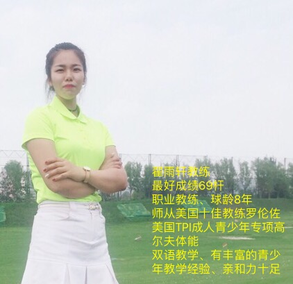翟雨軒教練:最好成績69桿,職業(yè)教練、球齡8年,師從美國十佳教練羅倫佐,美國TPI青少年成人專項高爾夫體能,雙語教學,具有豐富的青少年教學經(jīng)驗。