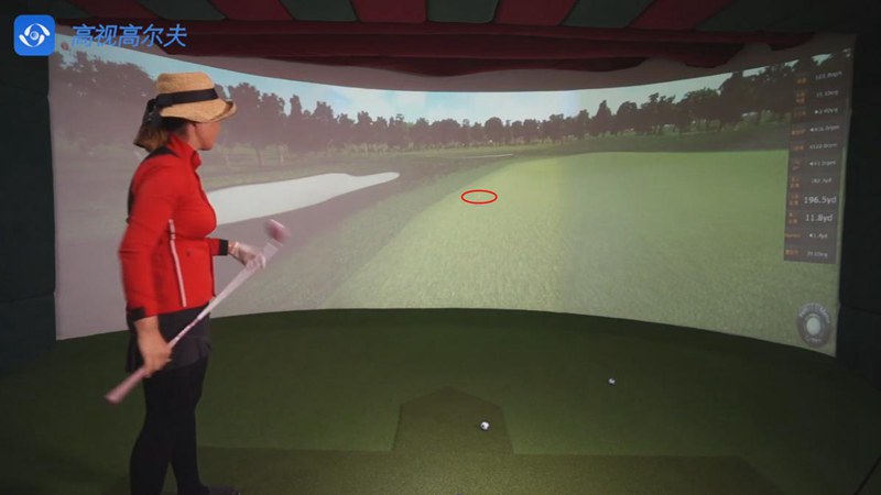 教學(xué)視頻中,根據(jù)到果嶺的距離以及果嶺左側(cè)沙坑的情況,老師拿出3號(hào)木,朝果嶺右側(cè)一點(diǎn)的方向進(jìn)行了第二桿的擊打。在第二桿中,身體有些僵硬,老師進(jìn)行了第二次嘗試,這次成功了。