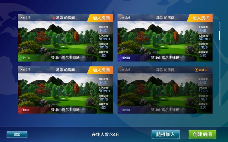 實(shí)時(shí)視頻對(duì)戰(zhàn),一人創(chuàng)建房間,多人加入,無論你身在何處,只要是中通數(shù)字高爾夫室內(nèi)高爾夫模擬器設(shè)備即可實(shí)現(xiàn)異地實(shí)時(shí)對(duì)戰(zhàn)約球,酣暢的享受競技的快感。