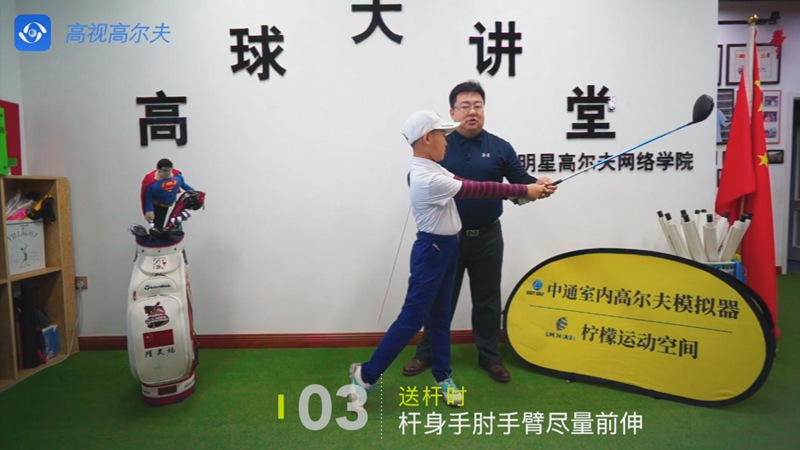 送桿時(shí)圓心到達(dá)左腿內(nèi)側(cè),桿身手肘手臂盡量向目標(biāo)方向伸。