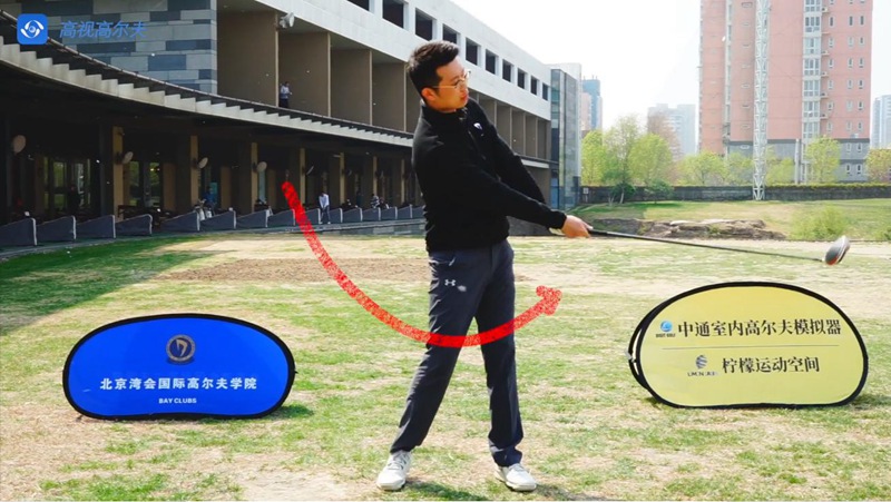 很多人會(huì)打出很大的右曲球,在上桿到頂點(diǎn)后,下桿時(shí)擊球角度從高到低,這個(gè)擊球角度是不對(duì)的,我們希望的擊球角度是從下往上的。