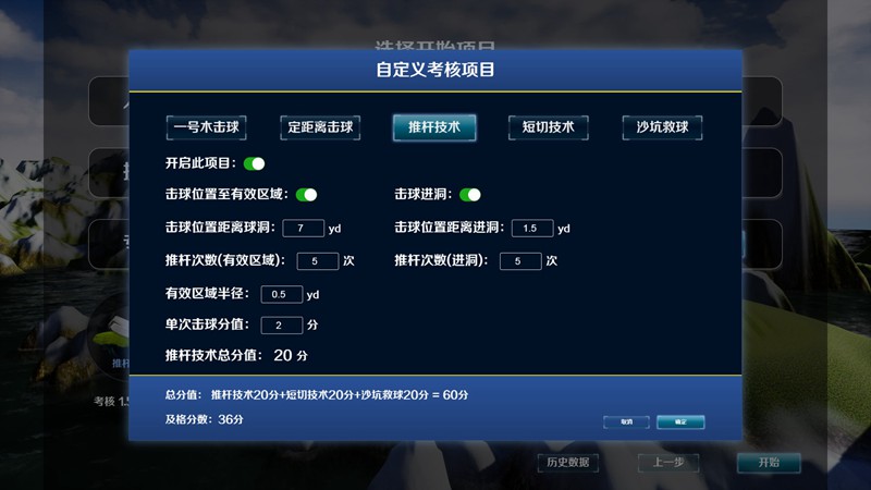 全揮桿、推桿、切桿、沙坑、下場(chǎng)5個(gè)科目。
