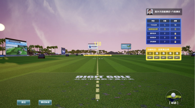 技能測(cè)試是經(jīng)過(guò)官方授權(quán)的DIGITGOLF軟件考試模塊。8個(gè)等級(jí)測(cè)試,全揮桿、推桿、切桿、沙坑、下場(chǎng)5個(gè)科目;用戶可根據(jù)需要自定義科目規(guī)則;場(chǎng)景多樣,增加趣味性。