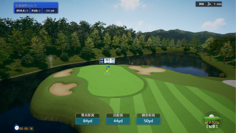 打開球場每洞擊球前會有語音介紹,比如春城湖畔高爾夫球場第1洞,整體預(yù)覽球道的同時會告訴你:386碼,標(biāo)準(zhǔn)桿4桿的球洞。