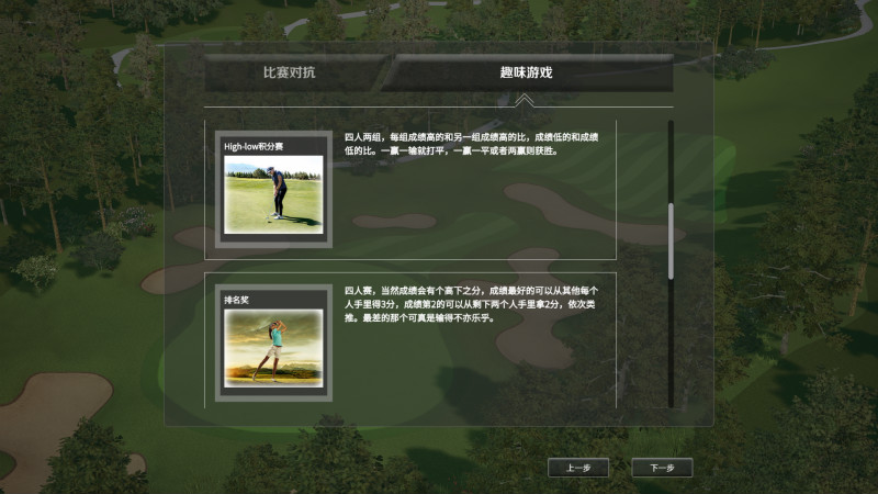 目前系統(tǒng)已經(jīng)解鎖的玩法有:二對二比賽、四人四球比桿、Bogey or Par、Stableford、High-low積分賽、排名獎。