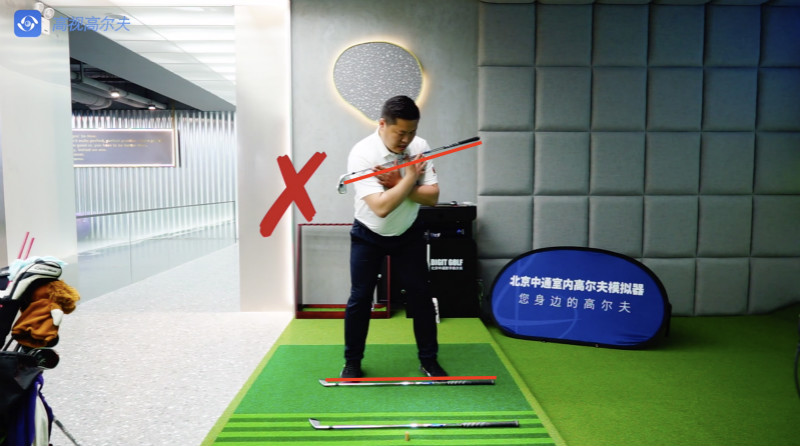 練習(xí)時(shí)在地上擺兩根球桿,做好擊球準(zhǔn)備后,球桿放于肩膀處,檢查肩膀的球桿與腳前的球桿是否平行。如果不平行,調(diào)整為平行。