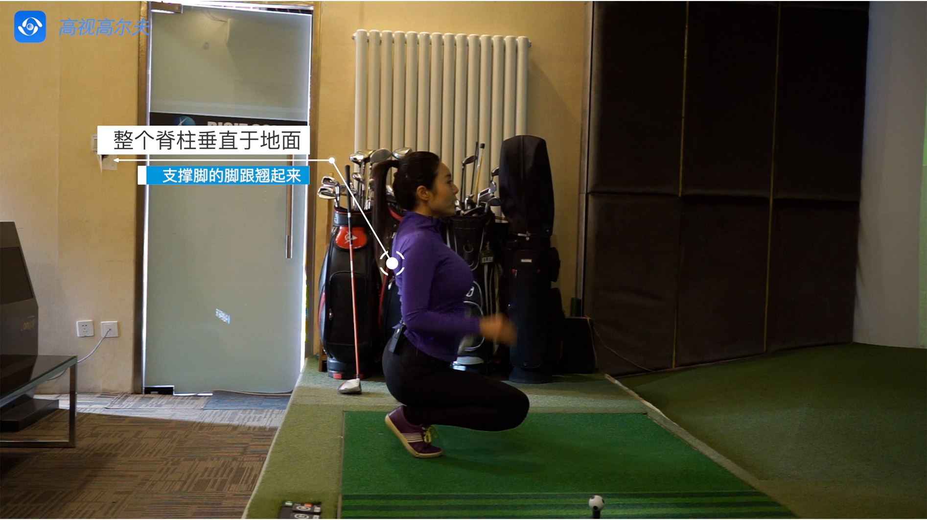 整個脊柱垂直于地面,支撐腳的腳跟翹起來。